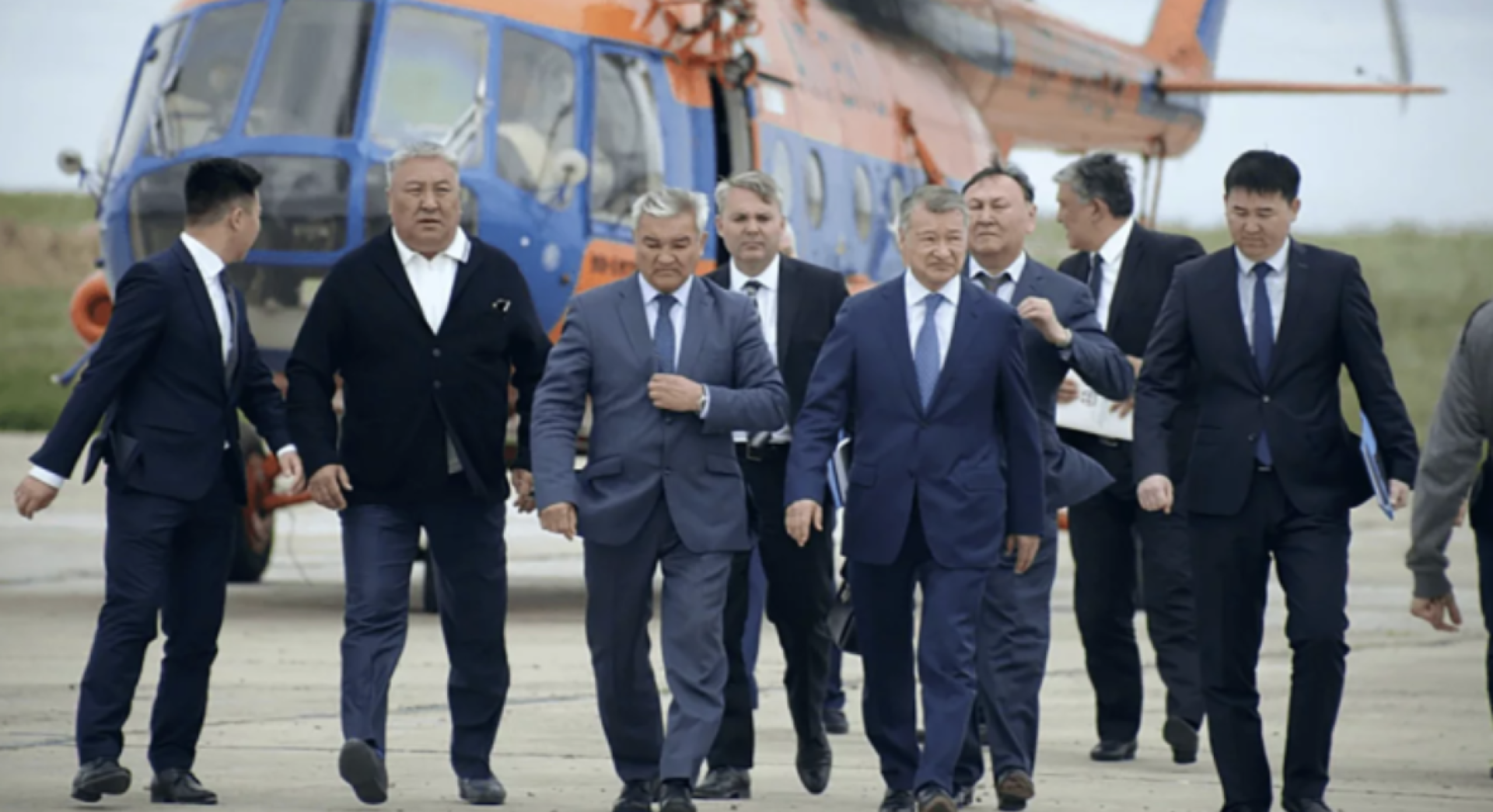 Экс-аким ВКО Даниал Ахметов (в центре в первом ряду) на фоне вертолёта МИ-8. Фото: Factum.kz
