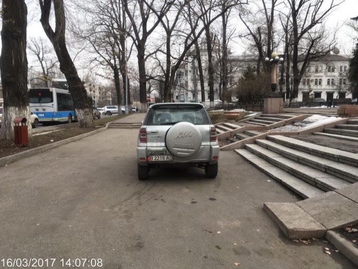 А здесь водитель оставил свою Toyota на тротуаре близ пересечения улиц Толе би - Момышулы.