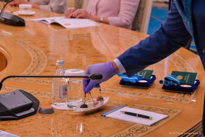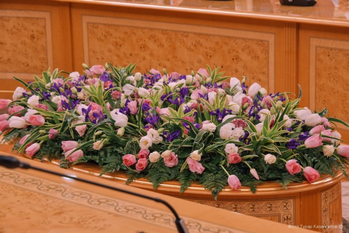Как правило, в преддверии 8 Марта в каждом учреждении страны мужчины стараются обходительно относиться к дамам. Акорда - не исключение. На встрече Нурсултана Назарбаева с представительницами женской общественности "Көктем шуағы", что можно перевести как "Весеннее сияние", всем приглашенным уделяли особое внимание. Чай женщинам разливали аккуратные во всех смыслах мужчины. На их пиджаках и галстуках можно было заметить необычные орнаменты, по всей видимости, это является отличительной особенностью служащих Акорды.