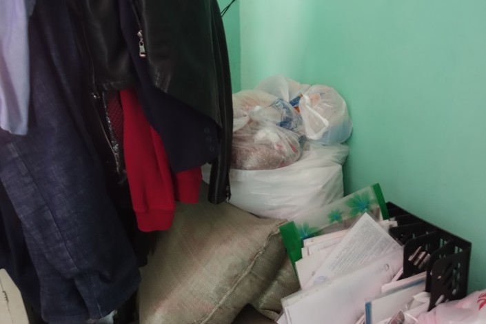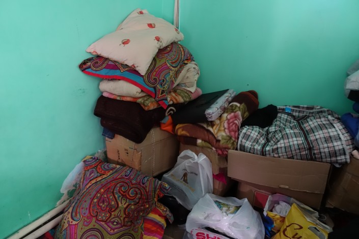 В углу напротив - мешки с крупами и другими сухими продуктами - это все тоже помощь. "Эти продукты привезли еще весной, всего пять мешков, я их по сортам разложил", - говорит Исатай.