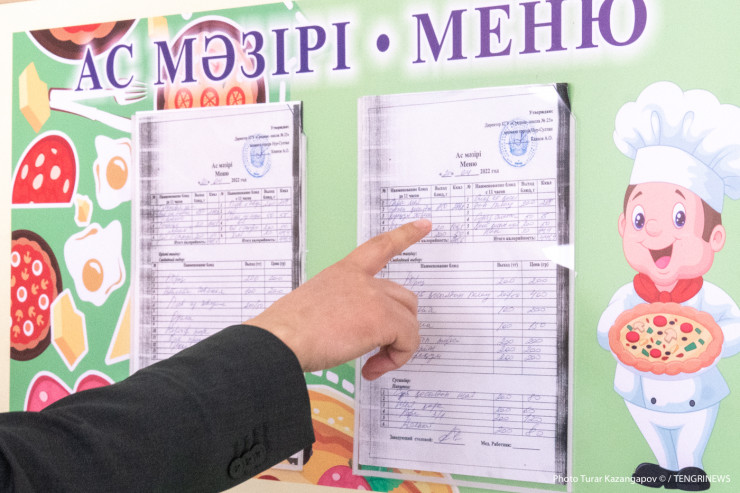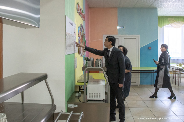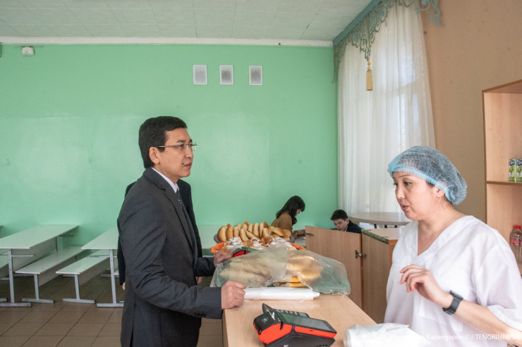 Проверка школы начинается со столовой. Министр обращает внимание на меню дня - его не обновили на текущую дату. Асхат Аймагамбетов спрашивает цены на воду, выпечку и горячие блюда. К слову, в этот день детям подавали гуляш с гречкой.