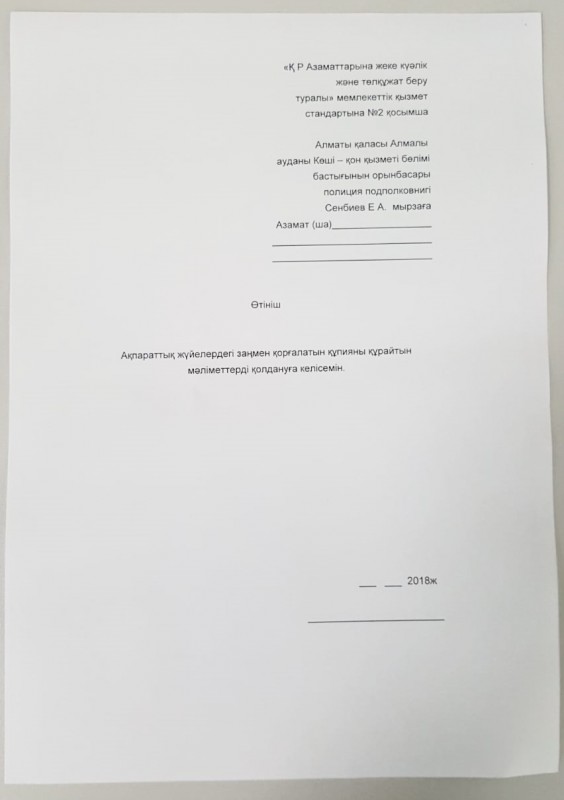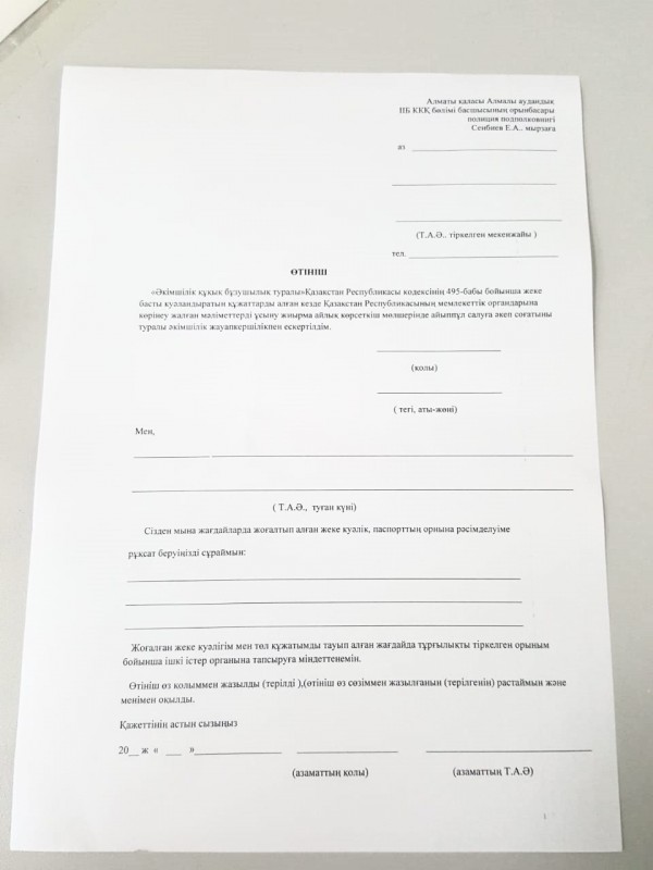 "Жоғалтып/ұрлатып алған адамдар өтініш жазады. Оның үстінде ҚР Әкімшілік құқық бұзушылықтар туралы кодексінің 492-бабына сәйкес ҚР тіркеусіз не жеке басты куәландыратын құжаттарсыз тұру айыппұлға әкеліп соқтыратынын білу керек. Арызды қайта жазуға келер болсам, өтірік айтқан жағдайда ол қылмыс саналатынын және жалған ақпарат берілсе, мойнымен көтеретіні жайлы өтінішке қол қояды", - дейді Айнұр.