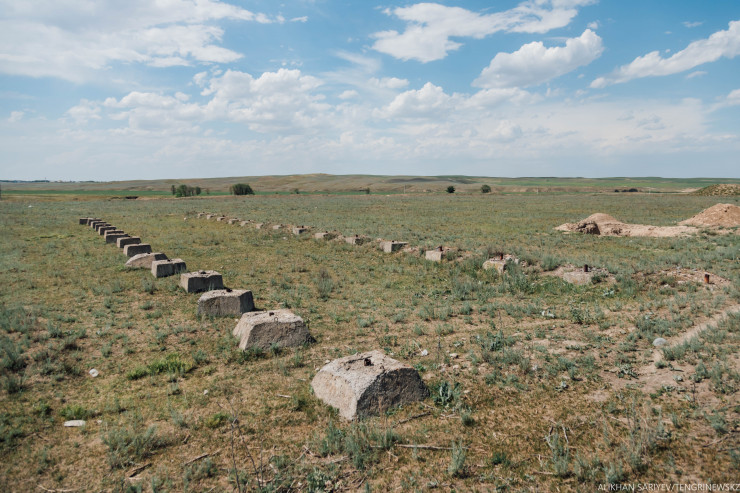 В своих поездках корреспонденты Tengrinews.kz, бывает, случайно замечают необычные объекты, историю которых хочется услышать, как говорится, из первых уст. На этот раз они обратили внимание на огромную территорию, усыпанную руинами, а вблизи - выжженное поле с захоронениями. Чтобы обойти это место пешком, понадобится не один час. И эта апокалиптичная картина сильно контрастирует с живописным озером неподалеку, в котором жизнь явно читается. О том, что происходило здесь десятки лет назад, рассказала местная жительница.