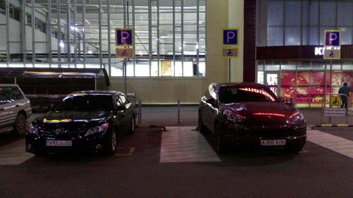 Тем не менее, очевидцы нередко фиксируют комичные картины - большой, роскошный джип припаркован прямо под знаком "Парковка для инвалидов". Вот как раз такой случай заснял на свой смартфон очевидец в вечернее время суток в Алматы. Внедорожник золотого цвета стоит на парковке для инвалидов перед торгово-развлекательным центром. Впрочем, доказательств того, что этот водитель не является инвалидом, у автора видео нет.