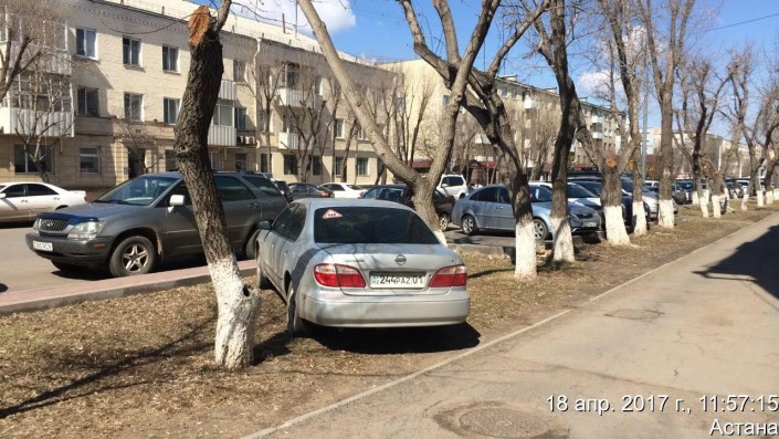 На проспекте Абая, между улицами Мамбетова и Ауэзова в Астане, водитель Nissan с номером 329NYA01 припарковался на газоне.