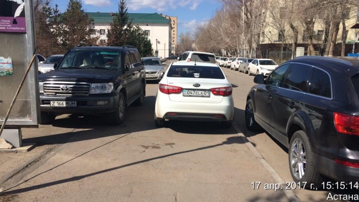 Стоянка прямо на тротуаре в Астане, автомобиль Kia с номером 047ELA01.