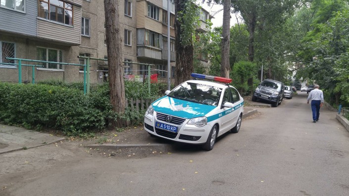 А здесь на газоне, точнее месте, где он должен быть, припарковались не только наглые водители, но и стражи порядка. Фото сделано 15 июня 2016 года примерно в 15.00 во дворе жилого дома в районе торгового центра "Есентай" выше проспекта Аль-Фараби.