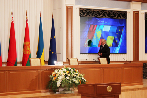 Сначала журналистам объявили, что состоится одна общая пресс-конференция по итогам саммита с участием лидеров "евразийской тройки", президента Украины и представителей ЕС. Чуть позже сказали, что общей пресс-конференции не будет, каждый из президентов сделает заявление для журналистов своих стран, но сначала будут двусторонние встречи. Потом и эту информацию поставили под сомнение. При каждом таком объявлении представители СМИ перебегали из одного зала в другой, с первого этажа на второй. Временами в этом хаотичном забеге участвовала не только пресса.