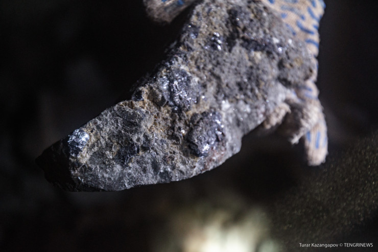 В сутки шахта выдает 5 тысяч тонн руды, пояснил Аслан. Внизу под светом фонарей он с гордостью показал то, ради чего шахтеры жертвуют здоровьем. Разбил простой с виду камень. И в нем заблестел ценный металл.