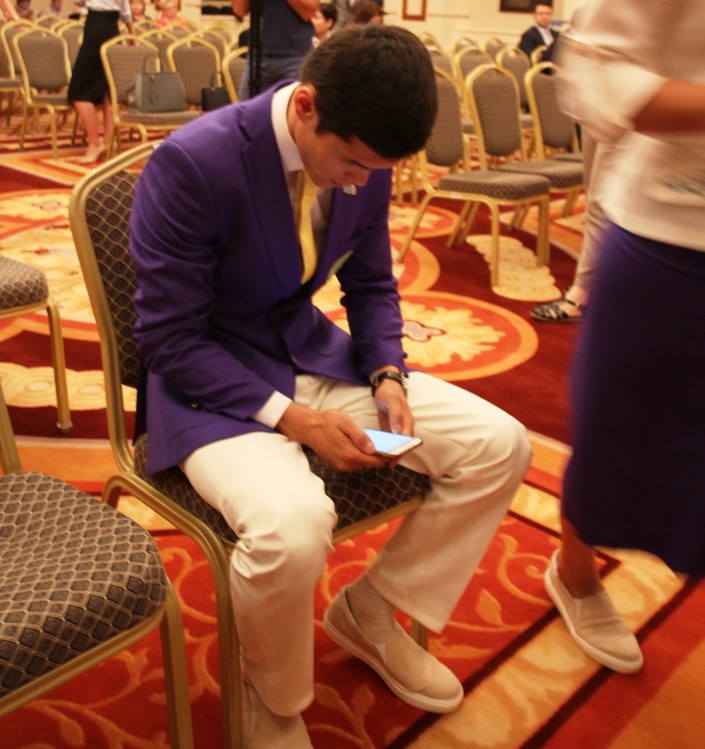 Вот, к примеру, не сразу можно было узнать в сидевшем парне, смотрящем в телефон, победителя Олимпиады боксера Данияра Елеусинова - настолько скромным человеком он казался в этот момент.