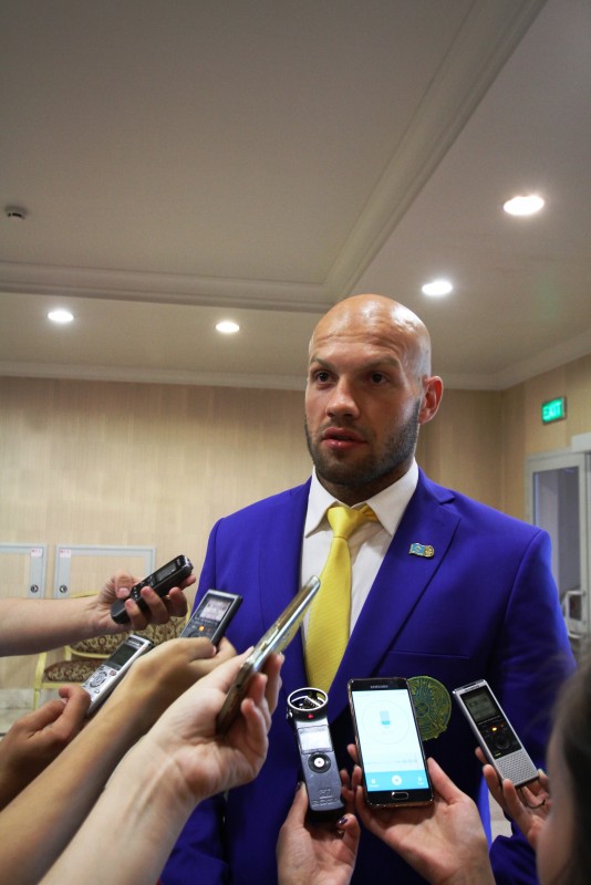 Не отказывал никому в совместном фото и все тот же Василий Левит, между делом продолжая давать интервью журналистам. Ответил боксер и на вопросы Tengrinews.kz.