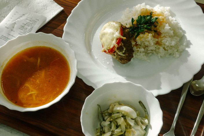 Салат из свежих овощей - 190 тенге, куриный суп - 220 тенге, плов из окорочков - 320 тенге.