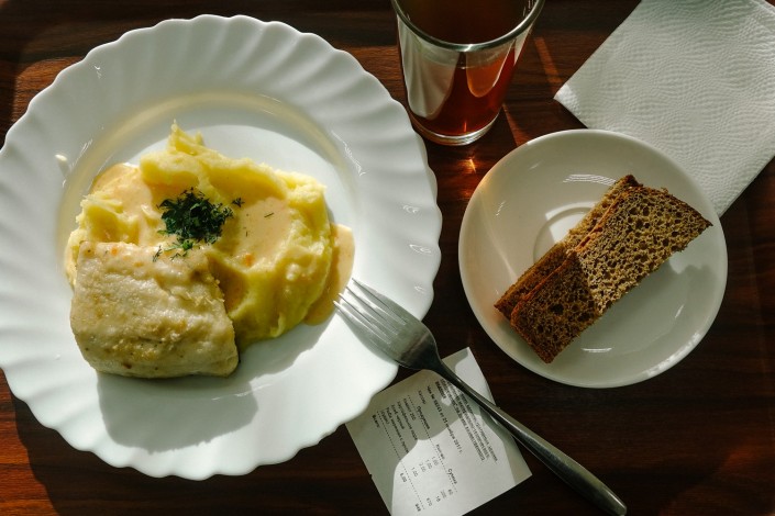 К примеру, судак жареный с луком - 670 тенге, пюре - 200 тенге, компот - 60 тенге, хлеб - 60 тенге.