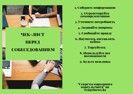 Вы составили хорошее резюме, вас позвали на собеседование. Как подготовиться, что рассказывать о себе, как говорить о зарплате? Tengrinews.kz продолжает серию материалов о карьерном консультировании. Наш эксперт Людмила Лукина составила чек-лист самопроверки из 9 пунктов перед собеседованием.
