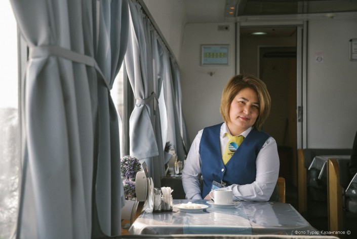 Она работает на поезде "Тальго" давно, с 2004 года. У Ляззат пятеро детей, и она обожает свою работу. "Я уже не могу без поезда. Если больше четырех дней дома, то уже сил нет - хочу в рейс. Мне уже и семья моя говорит: мама, поезжайте в рейс", - смеется женщина.
