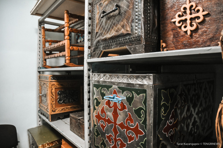 Сундуки самых разных размеров с казахскими орнаментами. В них хранили посуду, одежду и обувь, а также драгоценности. Когда дочерей выдавали замуж, в таких сундуках готовили для них приданое.