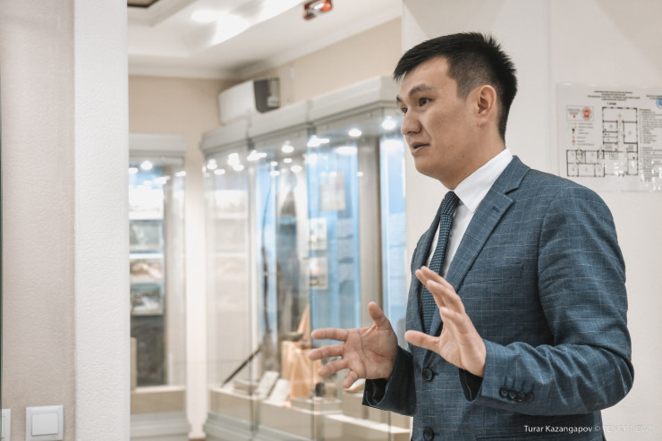 В помещениях фондов долго находиться нельзя, поэтому, увидев все самое интересное, покидаем их. Далее мы решили перейти к ознакомлению с залами музея. И здесь мы познакомились с научным сотрудником отдела археологии Сериком Искаковым. Он также является преподавателем истории. А еще не раз участвовал в археологических экспедициях.