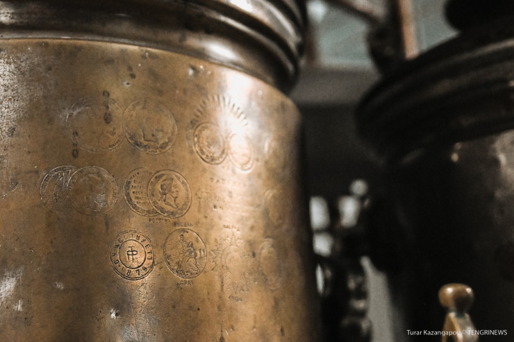 На одной из полок замечаем большую коллекцию самоваров. Клейма, оставленные на них, говорят о том, что эти самовары участвовали в различных ярмарках.