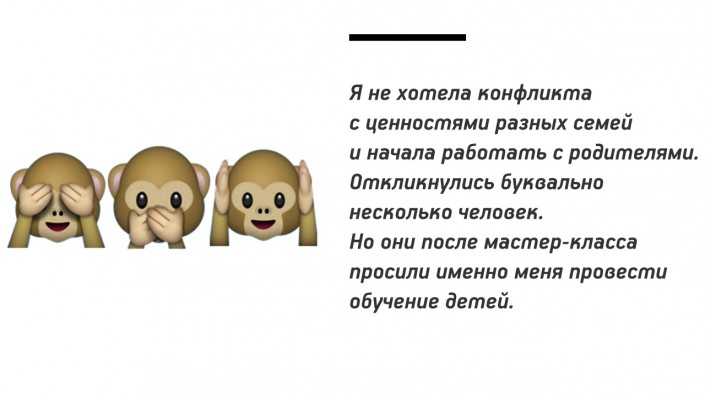 Для меня, как тренера, в программе есть три главных понятия: доверие, безопасность и ответственность. В принципе, весь подростковый возраст крутится вокруг темы секса. Я определяю свою задачу, как показать картину мира шире, чем подросткам доступно самостоятельно.