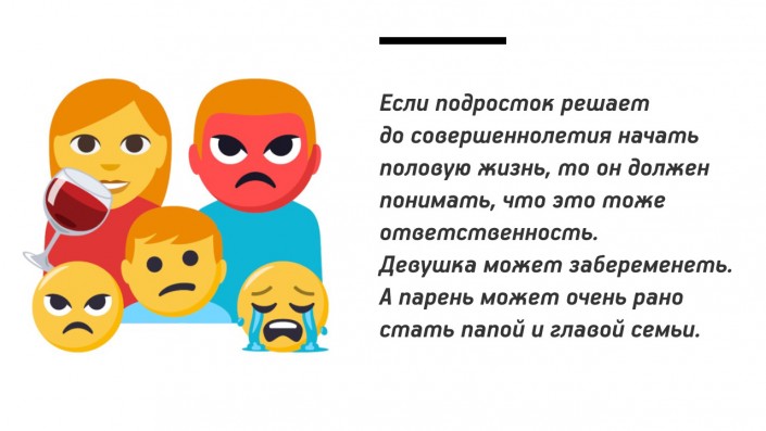 В этой части мне не хотелось сводить все к навязыванию шаблонов. В нашем обществе семья - это ценность. Но важно ребенку дать понять, что когда и с кем создавать семью - это его выбор. Вообще все в жизни - результат нашего выбора. Поэтому мы говорим об ответственности.