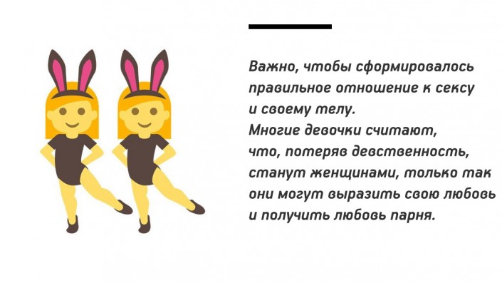 Окружающий мир нам транслирует нездоровые модели поведения через Интернет, телевидение, фильмы, высказывания взрослых, побуждая девочек рано начинать половую жизнь. Девочки, не имея другого источника информации, берут его за основу. Весь современный мир побуждает девочку к тому, чтобы она начала рано половую жизнь. Даже традиции в Казахстане таковы, что девочка - никто, она станет значимой, выполнит свое предназначение, когда выйдет замуж и родит детей. Именно поэтому у девочек появляется зацикленность на внешности и селфи. Она складывает губы уточкой, делает снимок, чтобы понять: "Какой я сексуальный объект? Меня возьмут замуж? Я крутая?"