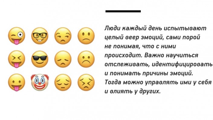 Значение эмоций на сегодня недооценено. Сегодня люди живут с выражением лица poker face, вместо истинных эмоций показывая: "У меня все ОК". Эмоции - это важный инструмент понимания себя и мира, позволяющий понять, что я хочу и как я могу это получить. Сдерживание и утаивание эмоций приводит к нарушению коммуникации: мы неверно распознаем сигналы других людей и принимаем неверные решения. Плохих эмоций не бывает: хочется плакать - надо плакать, хочется веселиться - надо веселиться. Однако если твои эмоции могут нанести вред другим людям, то надо понять, как их сдерживать. Мальчик злится, понимает, что эта энергия сидит в кулаках и ему хочется ударить кого-то. Но если он понимает, что драка, вымещение агрессии на другом человеке не поможет, то может задуматься: как можно утилизировать эту злость. Работа с эмоциями - это стать помощником самому себе.