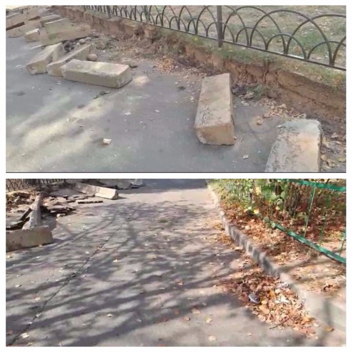 Еще одно сообщение из Алматы. "Хотел "похвалить" городской акимат и акимат Ауэзовского района за такую заботу о наших бордюрах. Меняют их во дворе каждые два года, "молодцы", что сказать. Хотя, например, могли бы сливную и арычную системы восстановить, чтобы вода во время дождя бежала по арыку, а не по асфальту (...)", - пишет возмущенный алматинец.