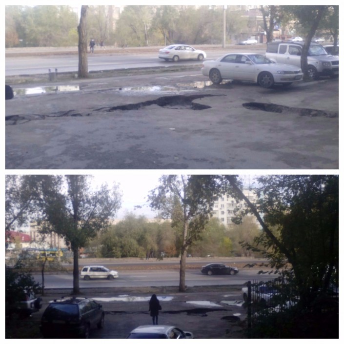 Открывает новый выпуск нашей рубрики фото провалившегося асфальта после замены труб на пересечении улиц Толе би и Тлендиева в Алматы.