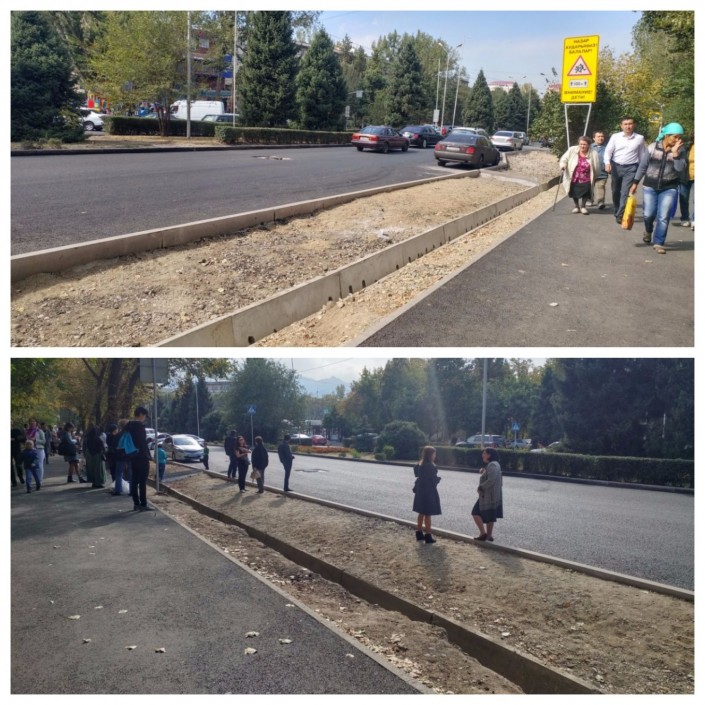 "Выхожу из главного входа парка имени Горького, иду по улице Жибек Жолы. Прохожу дорогу по пешеходному переходу, а дальше упираюсь в забор. Нам приходится идти по проезжей части, потому что там тротуара нет. Зачем тогда сделали пешеходный переход? Как должны люди идти с детьми?" - задался вопросом недовольный житель Алматы.