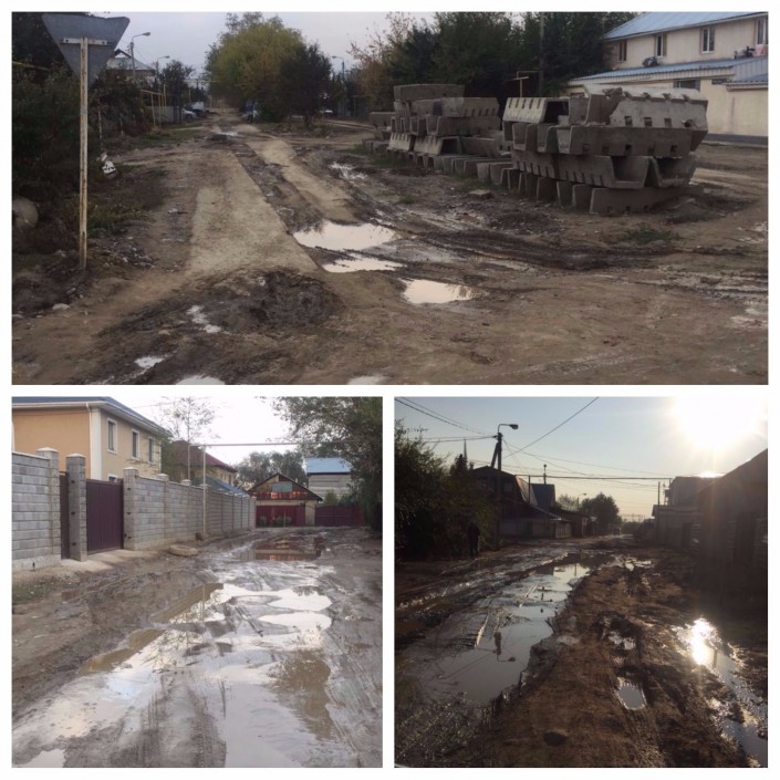 Еще один читатель из Алматы просит обратить внимание акима Ауэзовского района на состояние дорог в микрорайоне "Алтын Бесик". По его словам, каждый раз после дождя дорога в микрорайоне превращается в сплошное месиво из грязи и глины. Как выяснилось, асфальт там был, но его сняли еще в апреле из-за ремонта водопроводных труб.