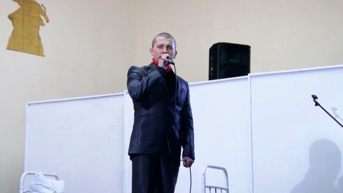 Разговор с Евгением прерывает конвоир. "Расскажи журналистам, как 1 декабря выступал. Чтобы поняли, что талантливый артист, что способный", - добавляет надзиратель.