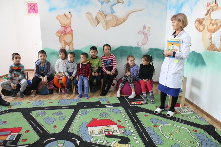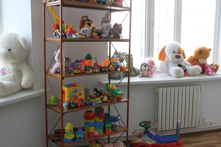 Делегация во главе с Еленой Тарасенко входит в яркую комнату, похожую на ту, которые бывают в детсадах. Там много детишек. Они здесь, пока родители на работе.