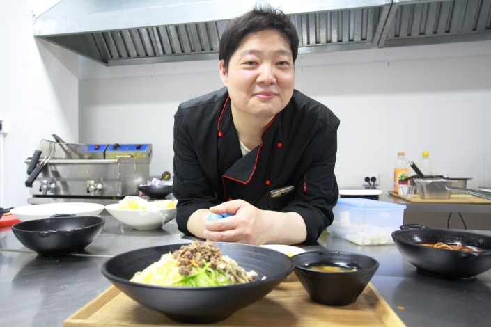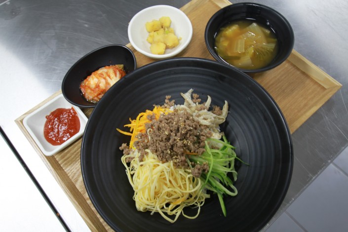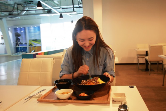 "Это блюдо называется "пибимпап", с корейского это можно перевести как "перемешивать", - говорит казахстанка Дина, работающая в корейском ресторане, который находится фактически над павильоном Южной Кореи.