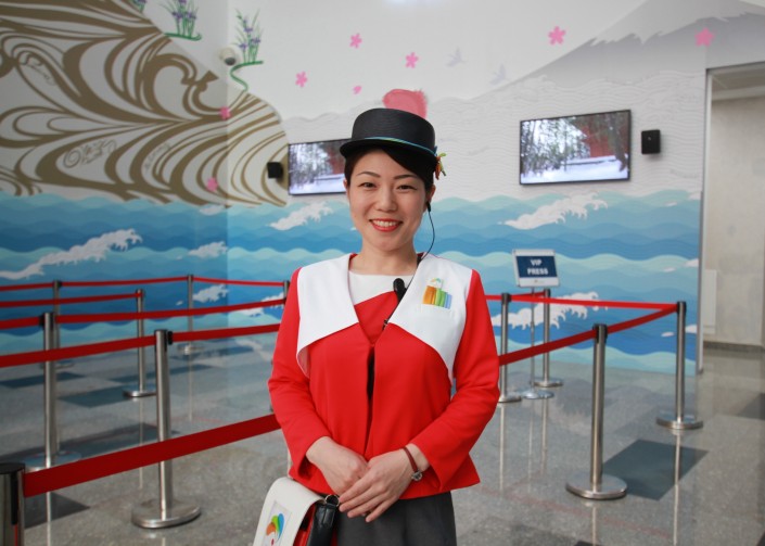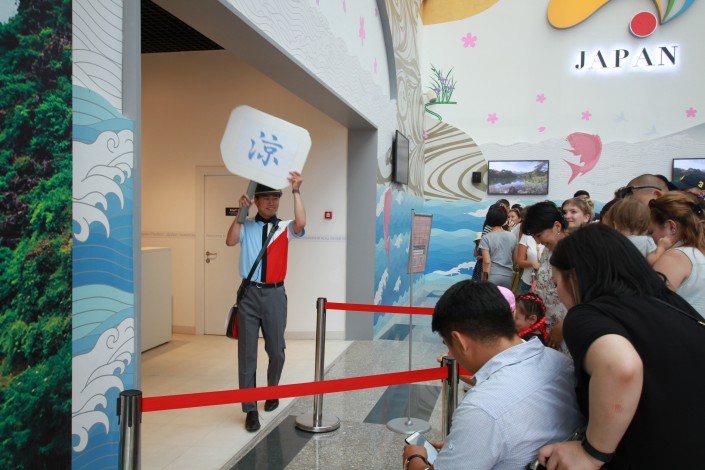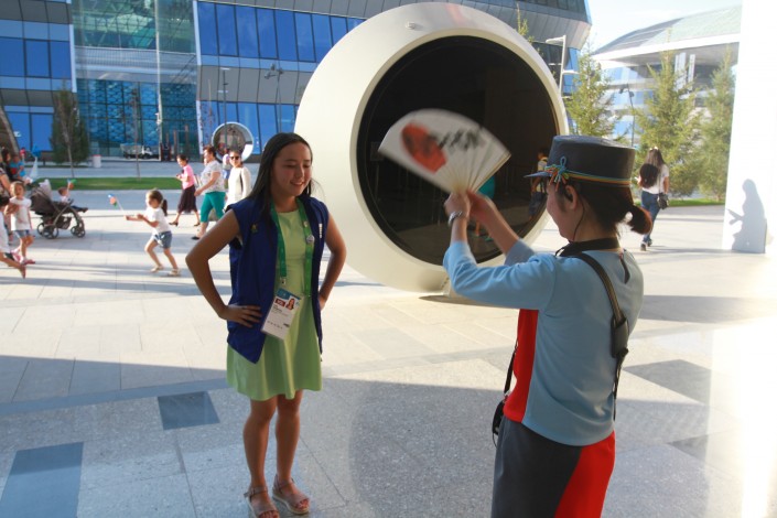 Японцы искренне удивляются, что казахстанцы знают, как будет "здравствуйте" на японском. Впрочем самим японцам, кажется, тоже приятно удивлять наших жителей. Перед входом в павильон сотрудники на трех языках приветствуют всех, выразительно произнося "Қош келдіңіздер!". А в жаркие дни они с удовольствием обмахивают посетителей выставки веером.