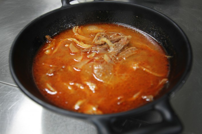 А вот еще одно блюдо - острый говяжий суп, очень полезный, как говорят корейцы. Его обычно подают на обед своим сотрудникам, но при желании его могут заказать и гости.