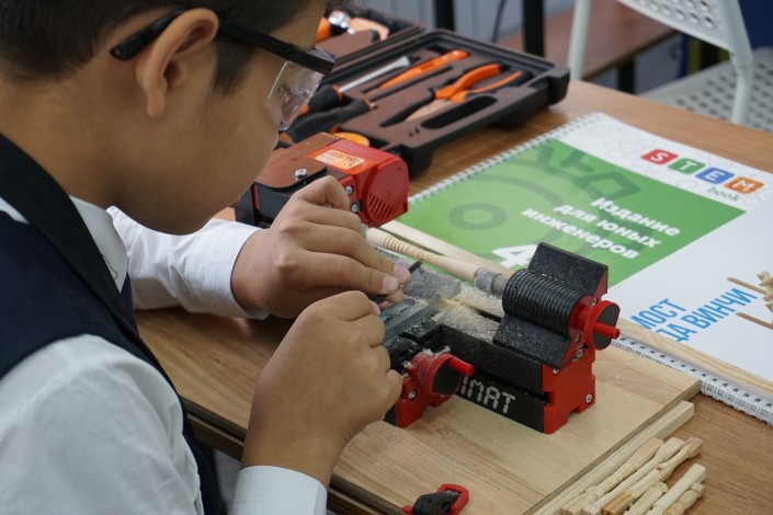 Здесь же другие ребята заняты какой-то программой на компьютере, где роботы выталкивают друг друга из круга. Чуть поодаль от них сидит еще один школьник и вырезает деревянные брусочки на небольшом станке. "На этом станке я, например, могу делать фигуры для шахмат", - поясняет он.