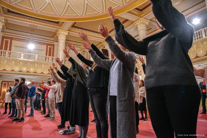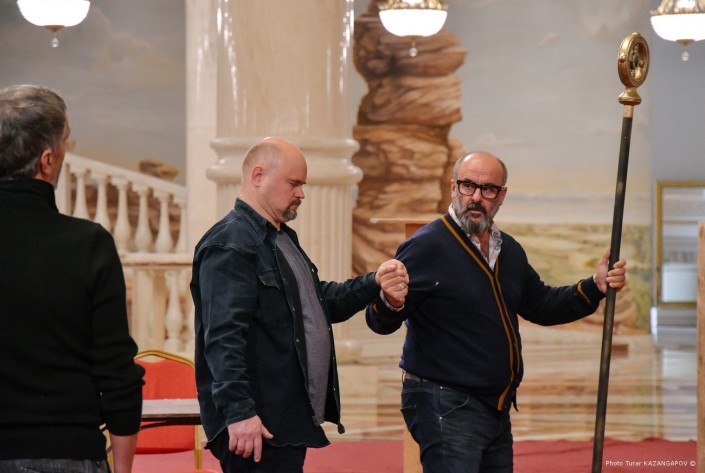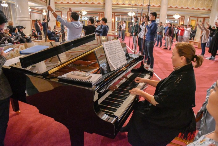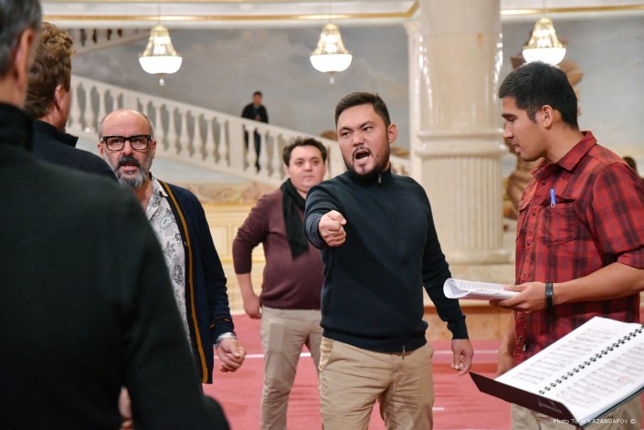 На улице пасмурно и идет дождь. А в фойе театра "Астана Опера" идет грандиозная репетиция. Мраморный зал театра обычно служит для сбора гостей, но сейчас тут импровизированная сцена, где артисты готовят финальную сцену одного из актов новой постановки.