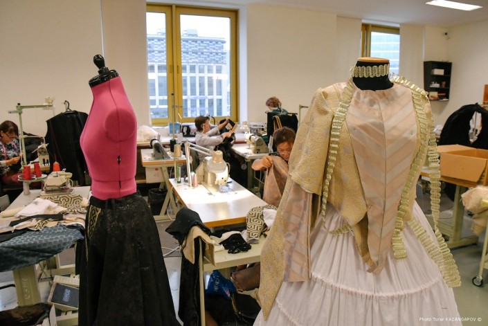 Работа по созданию костюмов в театре началась еще весной. Тогда художники разработали эскизы, подобрали образцы тканей и отделочных материалов. А уже с сентября в цехе началась работа по пошиву костюмов.