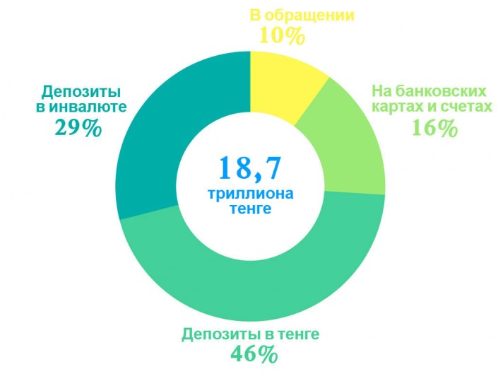 Согласно данным Нацбанка РК, общее количество денег в республике составляет 18,7 триллиона тенге. При этом в обращении в виде банкнот и монет находится 1,8 триллиона тенге. Именно эта сумма передается из рук в руки среди казахстанцев.