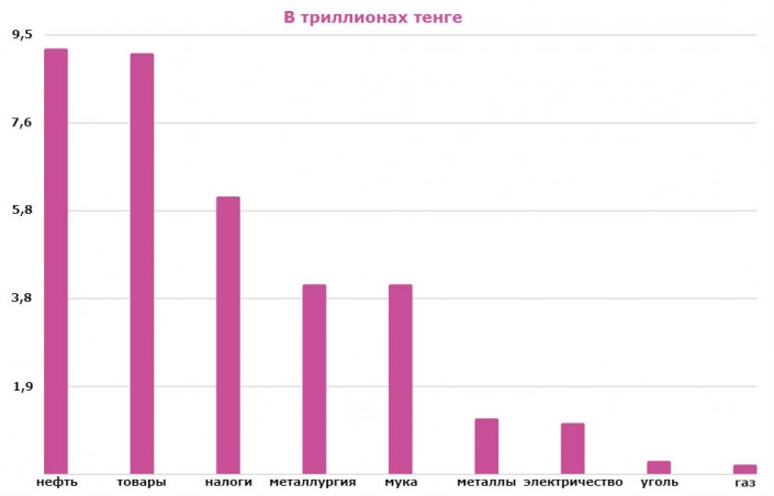 В 2017 году нефти в Казахстане было добыто на 9,2 триллиона тенге; товаров произведено на 9,1 триллиона тенге; металлурги выпустили продукции на 4,1 триллиона тенге; мукомолы намололи муки на 4,1 триллиона тенге; металлов было добыто на 1,2 триллиона тенге; произведено электроэнергии на 1,1 триллиона тенге; угля добыто на 281 миллиард тенге; газа - на 198 миллиардов тенге.