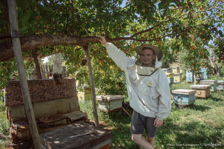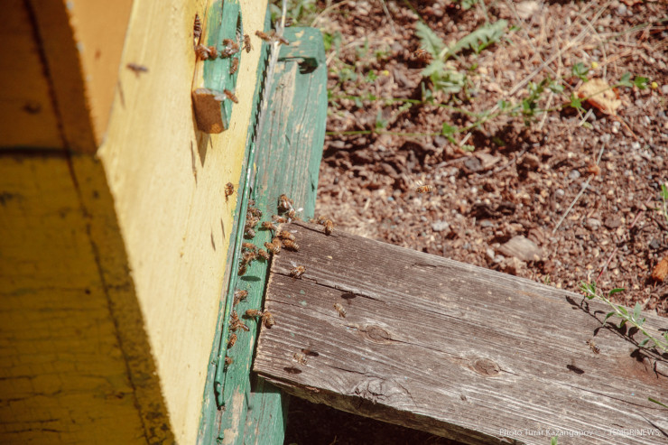Отметим, что условия съемки близки к экстремальным. В то время как Мубарак Рахимбаевич в защитном костюме, наш фотограф ходит между ульями в штанах и футболке.