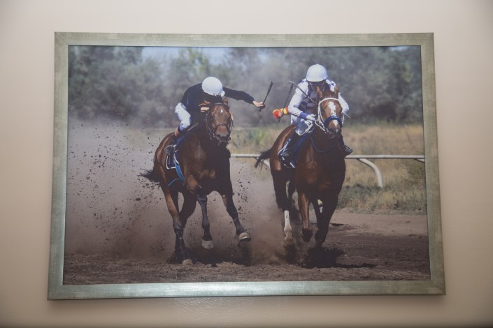 Мы с фотографом оглядываемся по сторонам: в кабинете действительно немало намеков на лошадей. На столе стоит грациозная статуэтка, на стенах - фотокартины. На одной из них - его питомец, чистокровный жеребец по кличке Нурторы (Гнедой). "У комбустиолога, наверное, плакаты со строением кожи должны висеть. А у меня - как у директора ипподрома", - с улыбкой говорит врач.