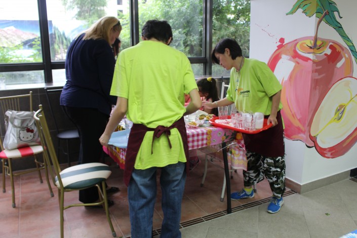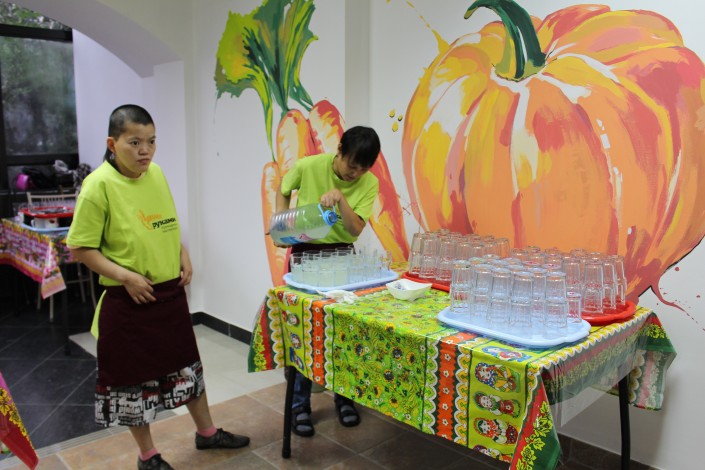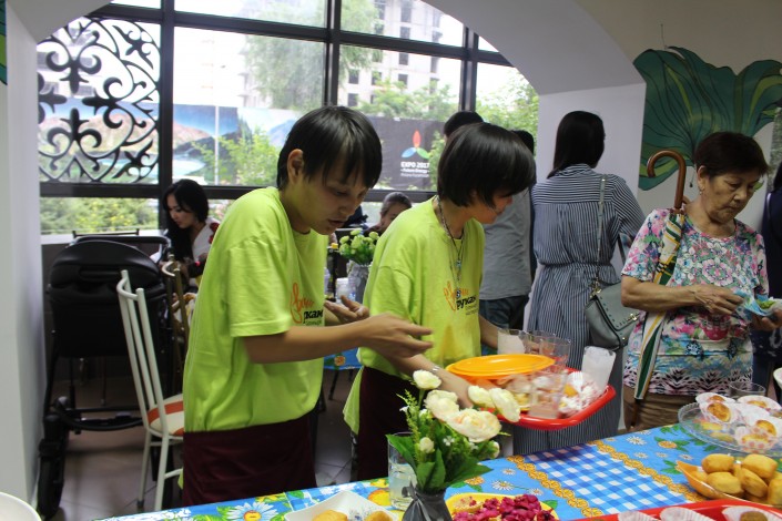 Мадина, Карлыгаш и другие ребята работают быстро, по ним сразу и не скажешь, что они имеют какие-то ограничения. Быстро накрывают стол, также быстро разливают напитки, убирают грязную посуду, отвечают на вопросы журналистов.