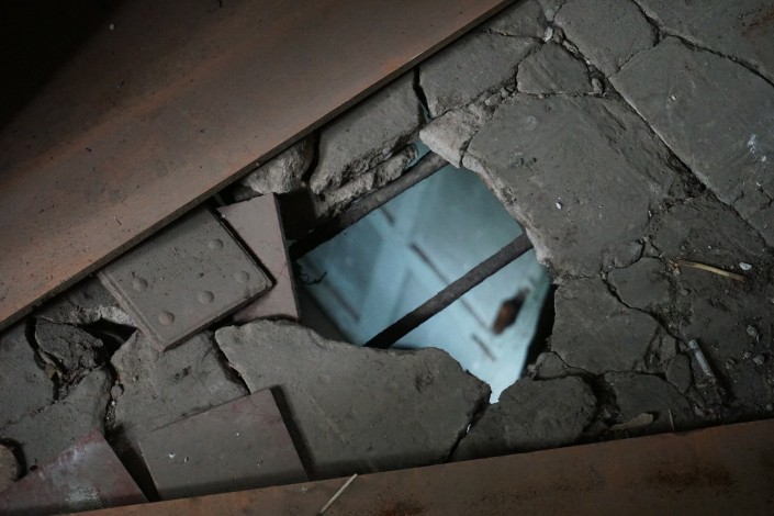 Местный житель поднимает дверь, а под ней - большая дыра, ведущая на первый этаж в бойлерную, где хранятся велосипеды и другие вещи.