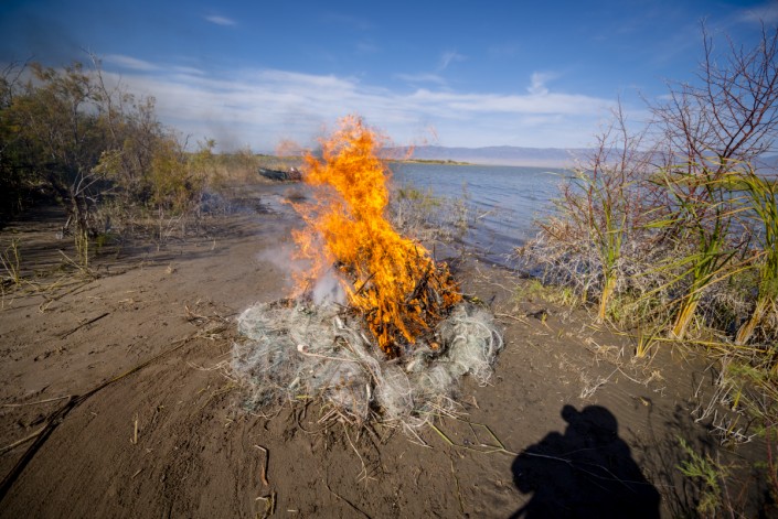 После фиксации на видеокамеру сети обычно сжигают на месте, чтобы браконьеры не могли использовать их повторно.