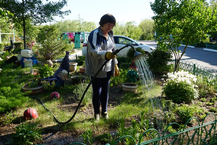 "По телевизору ее покажите, это самый лучший двор, похвалите ее, это все она делает", - говорит соседка, указывая на женщину, поливающую цветы в этом сказочном саду.
