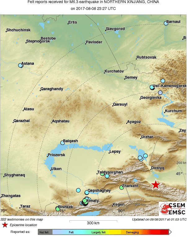 Напомним, произошедшее в Китае землетрясение почувствовали и в Казахстане. По данным ГУ "СОМЭ КН МОН РК", подземные толчки ощутимостью 4 балла почувствовали жители Алматы, Талдыкоргана и Жаркента. В Караганде и Усть-Каменогорске -2 балла.