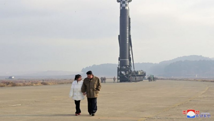 Северокорейское государственное агентство ЦТАК опубликовало фото главы КНДР, который идет за руку с дочерью Ким Чжу Э на процедуре запуска межконтинентальной баллистической ракеты "Хвасон-17", передает Tengrinews.kz.