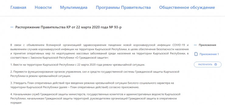 По ее данным, на официальном сайта правительства КР это распоряжение опубликовано на кыргызском языке: