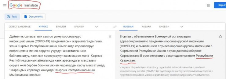 Вывод. Фотография распоряжения правительства № 93-p от 22 марта, содержащая слова "Республика Казахстан", является скриншотом страницы сайта с ошибочным переводом Google translate с кыргызского языка", - подтвердили в издании factcheck.kg.